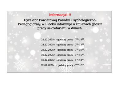 Zmiana godzin pracy sekretariatu Powiatowej Poradni Psychologiczno-Pedagogicznej...
